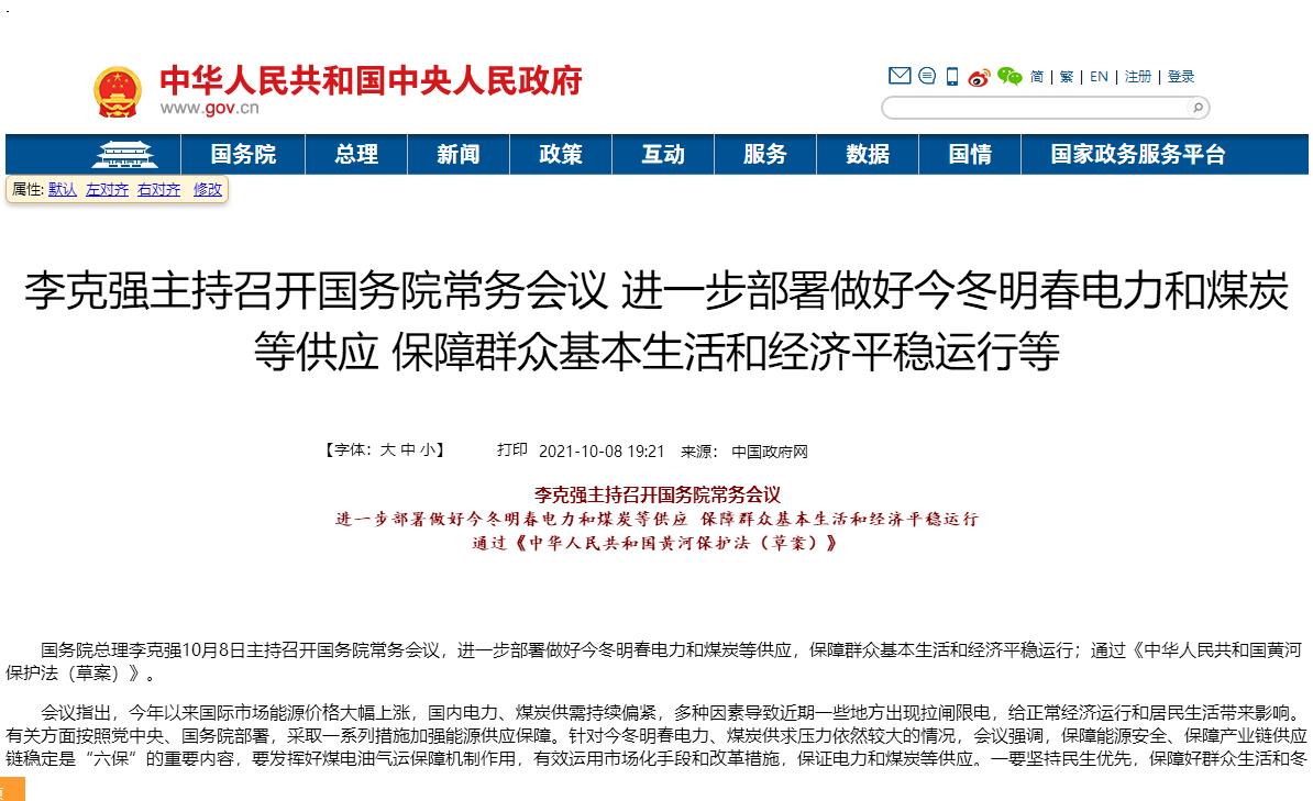 李克強(qiáng)主持召開國(guó)務(wù)院常務(wù)會(huì)議 進(jìn)一步部署做好今冬明春電力和煤炭等供應(yīng) 保障群眾基本生活和經(jīng)濟(jì)平穩(wěn)運(yùn)行等